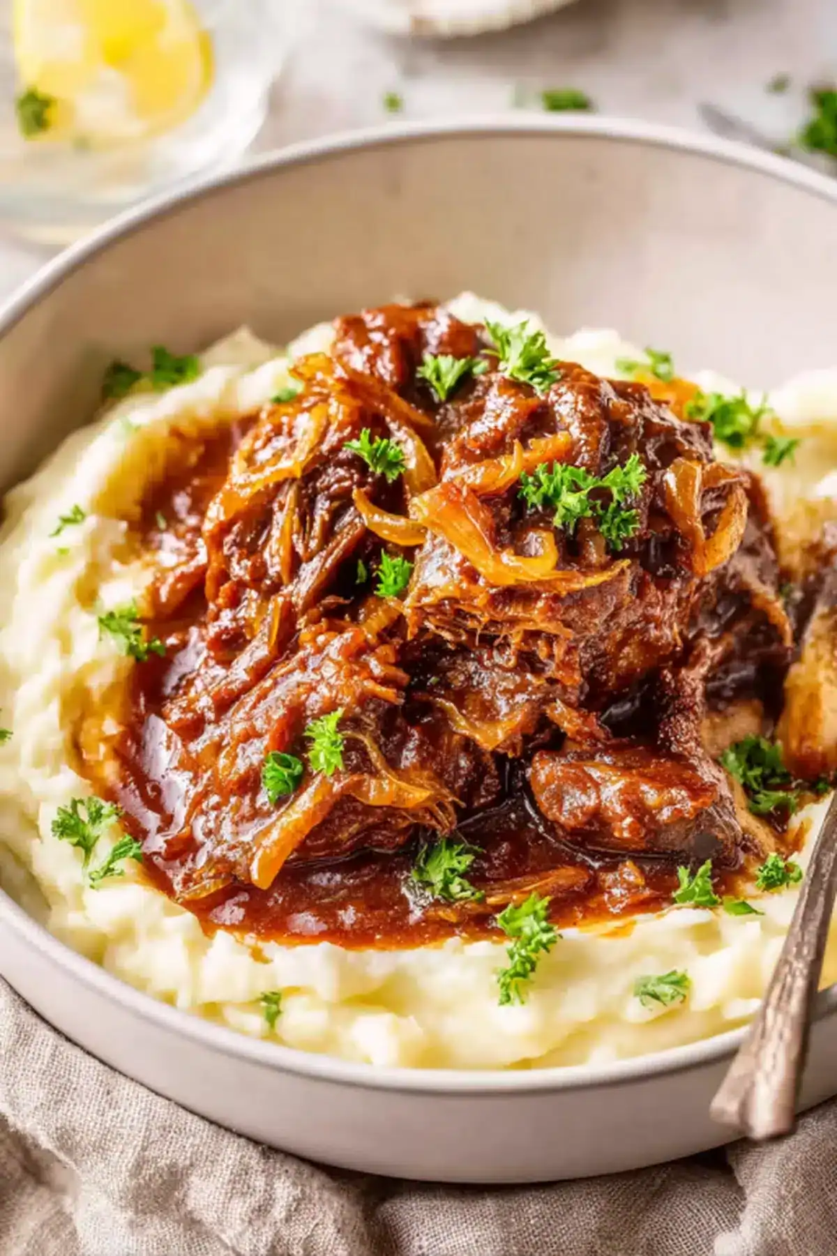 - Once done, shred the meat with two forks and serve over mashed potatoes, rice, or noodles. Spoon plenty of sauce on top.