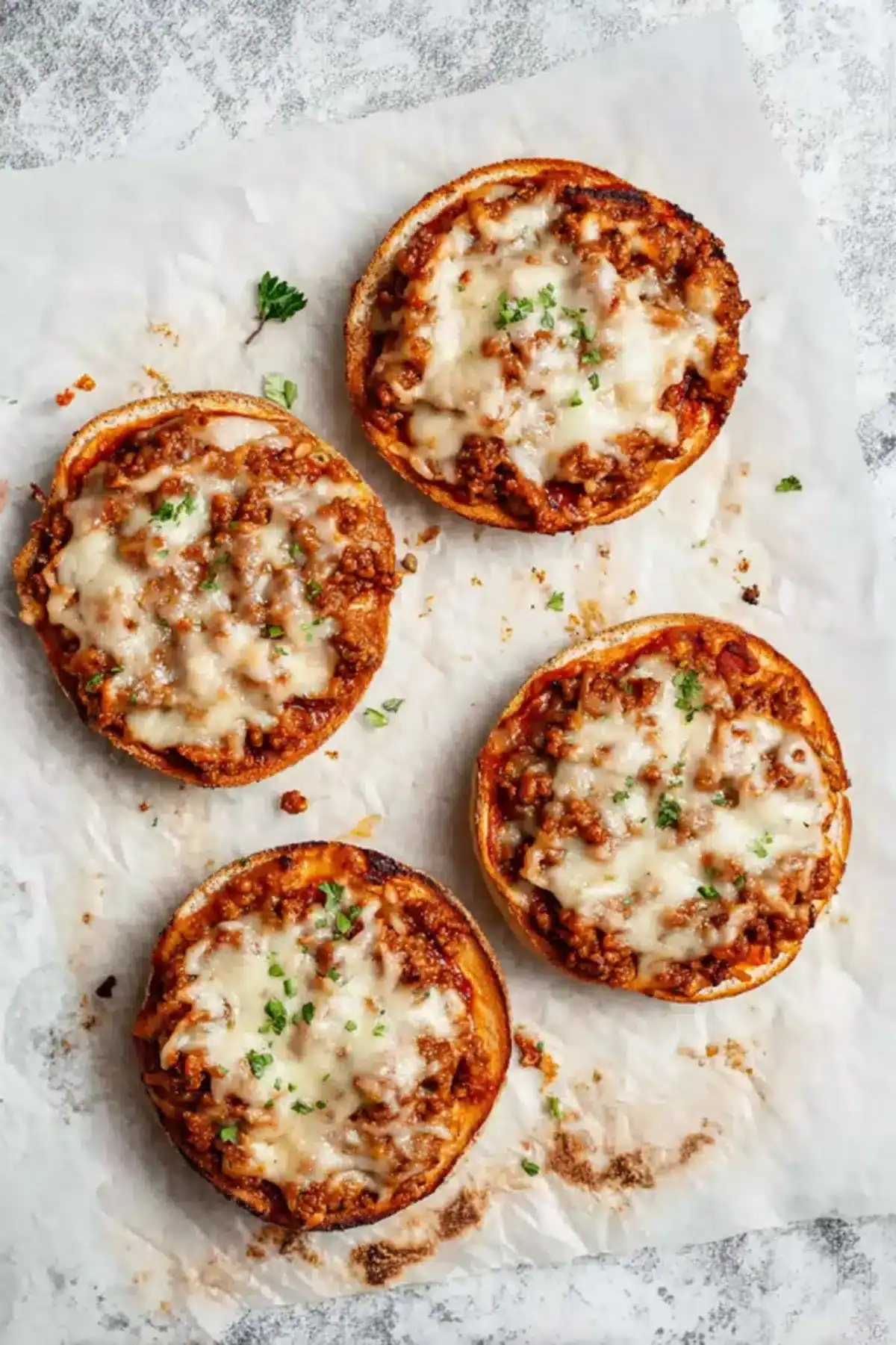- Spoon meat sauce on each half, top with vegan mozzarella