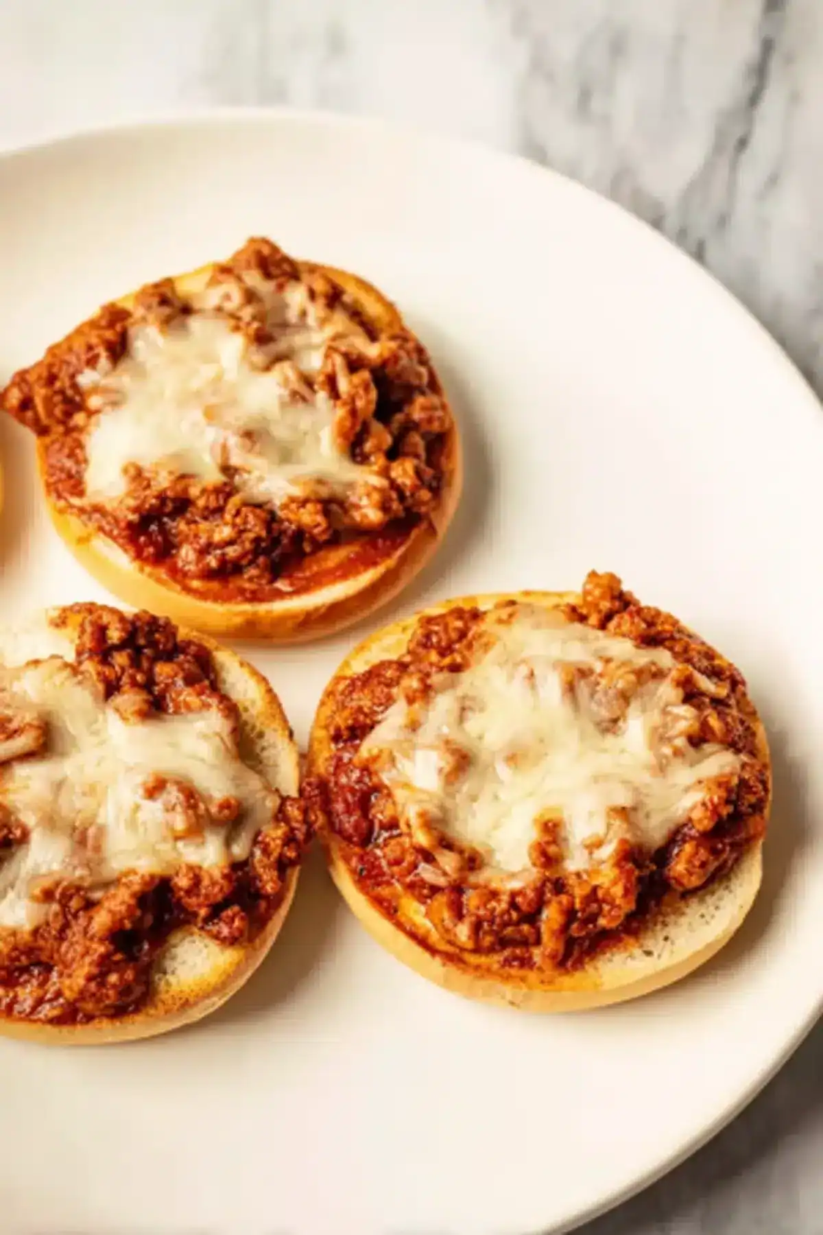 Slice the hamburger buns in half and arrange them open-faced on your prepared baking sheet. Spoon the meat sauce onto each half, then top with shredded vegan mozzarella.